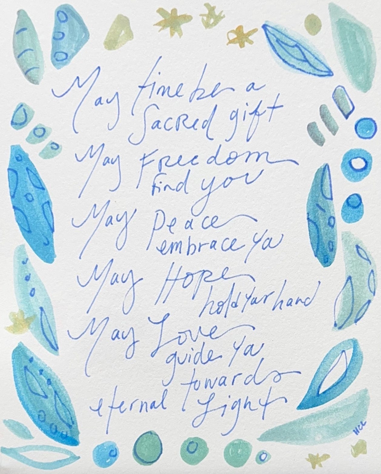 With each day that went by I worried perhaps it would be too late to send a letter all the way from France to get there in time. I went ahead and tried to find words to write not knowing much about this person’s life, spiritual experiences or story- yet it was healing and important for me to write. I had read Psalm 18 that morning that talked about bringing us out of “deep waters” and into a spacious and broad place. I walked down the hill later that day to pop it into the little yellow mail box in the french countryside like an act of prayer- may she find a broad and spacious place…May she find rest from these deep waters of cancer. A simple poem blessing with a blue border will travel over the ocean in the coming weeks: